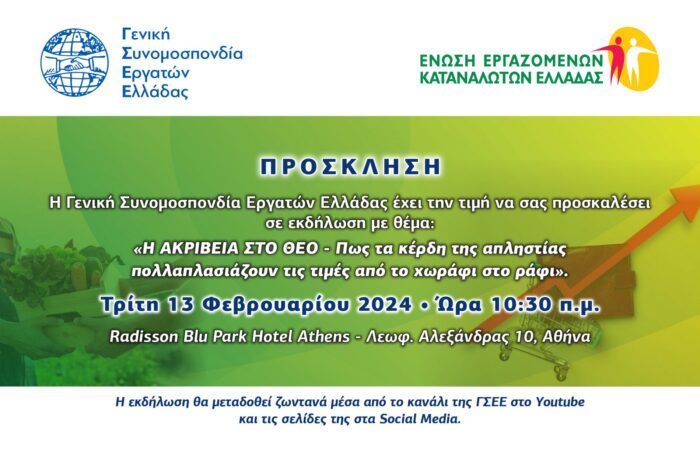 Το κύμα ακρίβειας και τα φαινόμενα αισχροκέρδειας σαρώνουν τα εισοδήματα και εξανεμίζουν την αγοραστική δύναμη των καταναλωτών. Η ΕΕΚΕ στήριξε τον αγώνα των εργαζομένων στον πρωτογενή τομέα στο μεγάλο συλλαλητήριο που έλαβε χώρα την Τρίτη, 20 Φεβρουαρίου 2024. Ακολουθεί φωτογραφικό υλικό: