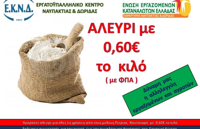 ΔΕΛΤΙΟ ΤΥΠΟΥ Το Ε.Κ.Ν.Δ. και η Ένωση Εργαζομένων Καταναλωτών Ελλάδας – Παράρτημα Ναυπακτίας & Δωρίδας στο πλαίσιο της διάθεσης προϊόντων «Χωρίς Μεσάζοντες» ανακοινώνουν την έναρξη παραγγελιών αλευριού. Το αλεύρι που παραγγείλατε παρασκευάζεται από τους Μύλους «Κουτσιαρή» και διατίθεται στις εξής συσκευασίες: Αλεύρι μαλακό για