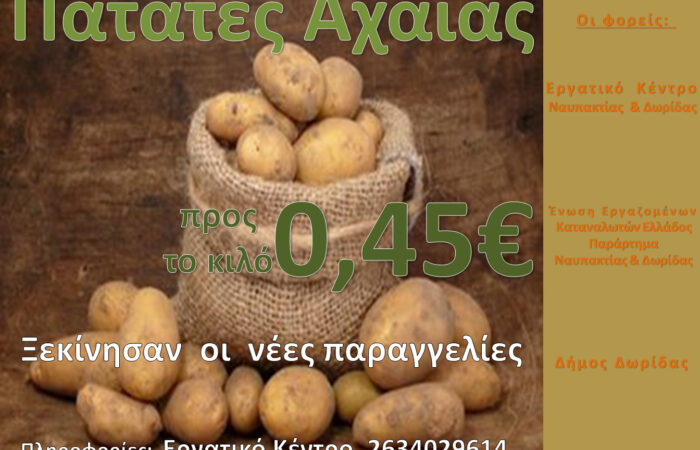 ΔΕΛΤΙΟ ΤΥΠΟΥ Χωρίς Μεσάζοντες Με αλληλεγγύη απαντάμε στην κρίση Το Ε.Κ.Ν.Δ. και η Ε.Ε.Κ.Ε. Ναυπακτίας & Δωρίδας σε συνεργασία με το Δήμο Δωρίδας ανακοινώνουν ότι η επόμενη διανομή αγροτικών προϊόντων Χωρίς Μεσάζοντες θα είναι ΠΑΤΑΤΑ Αχαΐας νέας εσοδείας. Οι πατάτες είναι άριστης ποιότητας, ποικιλίας Fabula