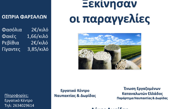 ΔΕΛΤΙΟ ΤΥΠΟΥ Το Ε.Κ.Ν.Δ. και η Ένωση Εργαζομένων Καταναλωτών Ελλάδας-Παράρτημα Ναυπακτίας & Δωρίδας σε συνεργασία με το Δήμο Δωρίδας στο πλαίσιο της διάθεσης προϊόντων «Χωρίς Μεσάζοντες» προγραμματίζουν την παραγγελία όσπριων από την περιοχή των Φαρσάλων. Η νέα πρωτοβουλία αφορά στην προμήθεια όσπριων (φασόλια, ρεβίθια, φακές,