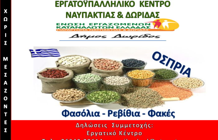 ΔΕΛΤΙΟ ΤΥΠΟΥ Το Ε.Κ.Ν.Δ. και η Ένωση Εργαζομένων Καταναλωτών Ελλάδας-Παράρτημα Ναυπακτίας & Δωρίδας στο πλαίσιο της διάθεσης προϊόντων «Χωρίς Μεσάζοντες» προγραμματίζουν την παραγγελία όσπριων από την περιοχή των Φαρσάλων. Η νέα πρωτοβουλία αφορά στην προμήθεια όσπριων (φασόλια, ρεβίθια, φακές) από Ομάδα Παραγωγών Ζωοδόχου Πηγής Φαρσάλων.