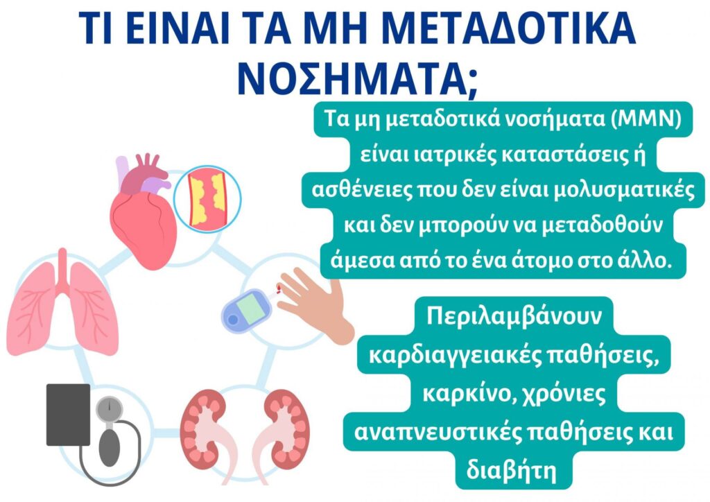 Τα Μη Μεταδοτικά Νοσήματα (ΜΜΝ), γνωστά και ως χρόνιες ασθένειες, είναι ασθένειες που δεν μεταδίδονται από το ένα άτομο στο άλλο, όπως καρδιαγγειακές παθήσεις, διαβήτης, καρκίνοι και χρόνιες παθήσεις του αναπνευστικού. Τα ΜΜΝ είναι αποτέλεσμα ανθυγιεινού τρόπου ζωής, π.χ. κάπνισμα, σωματική αδράνεια, ανθυγιεινή διατροφή και χρήση αλκοόλ, που οδηγούν σε μεταβολικές και φυσιολογικές αλλαγές. Στις ευρωπαϊκές χώρες, τα ΜΜΝ ευθύνονται σε έναν μεγάλο βαθμό για την επιβάρυνση που αντιμετωπίζουν τα συστήματα δημόσιας υγείας στα κράτη μέλη. Τα αυξανόμενα ποσοστά θανάτων που σχετίζονται με τα ΜΜΝ στην Ευρώπη είναι ανησυχητικά, αλλά αν και είναι ανεξέλγκτα, τα περίπλοκα ζητήματα υγείας που προκαλούνται από τα ΜΜΝ μπορούν να αντιμετωπιστούν, εάν βελτιώσουμε τα μέτρα πρόληψης και προωθήσουμε την υγεία.