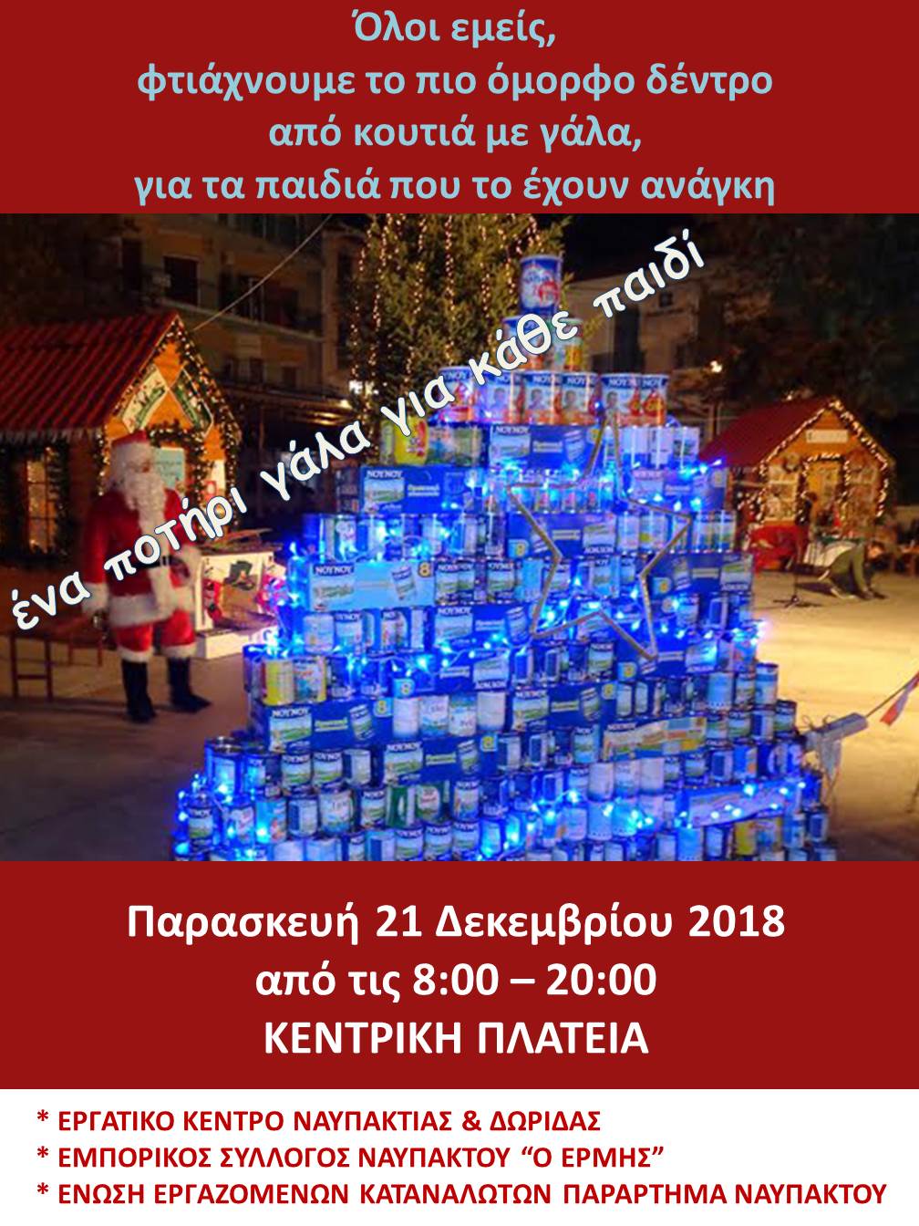 Ένα ξεχωριστό χριστουγεννιάτικο δέντρο, φτιαγμένο από κουτιά γάλα, θα στολίσουν για πέμπτη συνεχή χρονιά το Εργατικό Κέντρο Ναυπακτίας & Δωρίδας, ο Εμπορικός Σύλλογος Ναυπάκτου, και το Παράρτημα της Ένωσης Εργαζομένων Καταναλωτών.