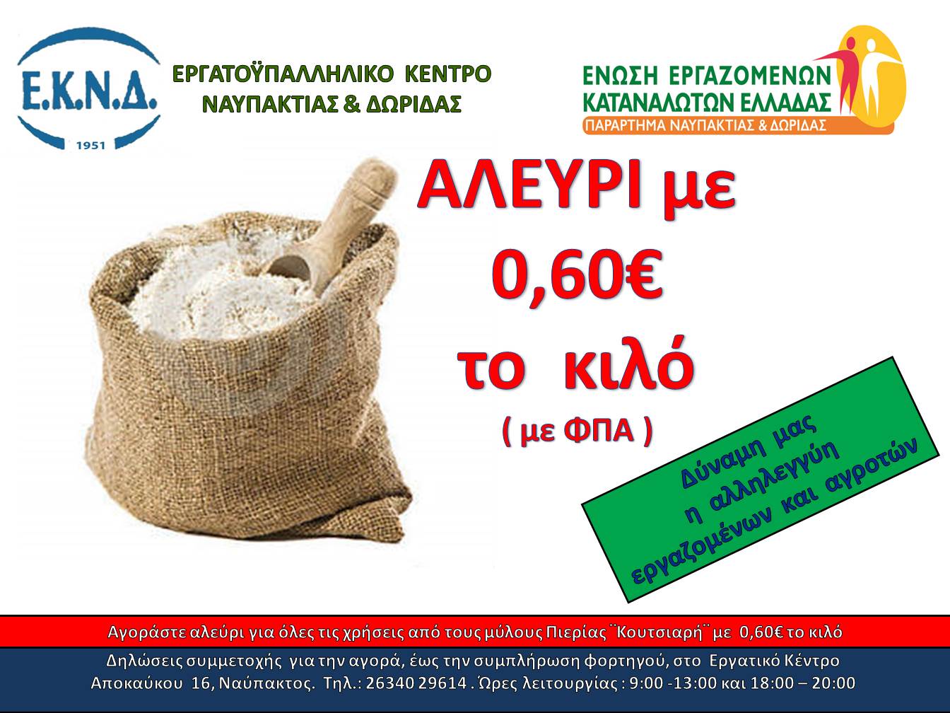 Το Ε.Κ.Ν.Δ. και η Ένωση Εργαζομένων Καταναλωτών Ελλάδας – Παράρτημα  Ναυπακτίας & Δωρίδας στο πλαίσιο της διάθεσης προϊόντων «Χωρίς Μεσάζοντες» ανακοινώνουν  την έναρξη παραγγελιών αλευριού.