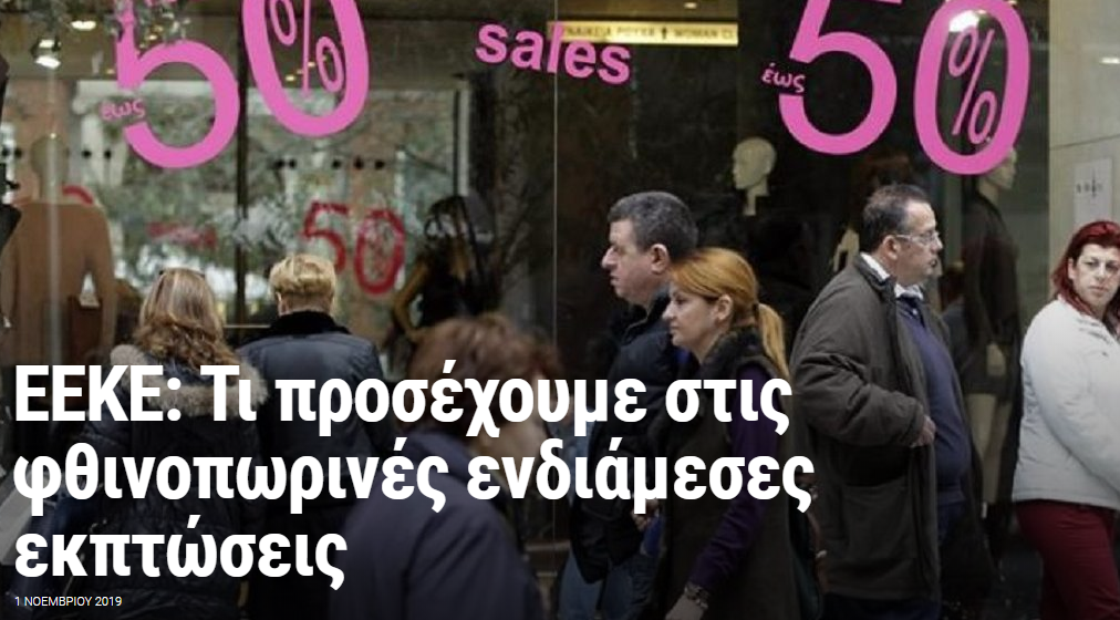 Χρήσιμες οδηγίες δίνει η Ένωση Εργαζομένων Καταναλωτών Ελλάδας (ΕΕΚΕ) προς τους καταναλωτές για τις φθινοπωρινές ενδιάμεσες εκπτώσεις ξεκίνησαν σήμερα Παρασκευή 1η Νοεμβρίου και θα λήξουν στις 15 Νοεμβρίου 2019, αναφέροντας «αναμένονται να τονώσουν, κατά το δυνατόν, την αγορά αλλά και να δώσουν τη δυνατότητα στους καταναλωτές – με διαθέσιμο για την πραγματοποίηση αγορών εισόδημα – να αποκτήσουν προϊόντα που ενδεχομένως δεν μπορούσαν να αποκτήσουν στην αρχική τους τιμή».